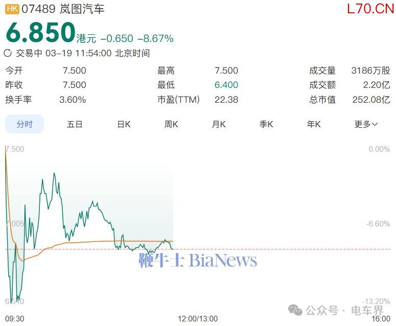 截至发稿,岚图股价下跌8.67%,报6.85港元/股,总市值252.08亿港元。