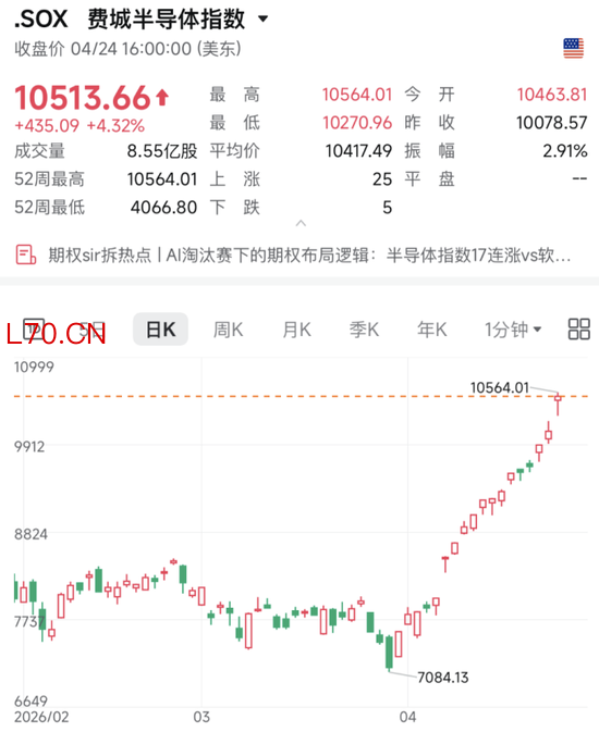 近日,美股芯片股全线飙涨。美东时间4月24日,费城半导体指数大涨超4%,连续18个交易日录得上涨,其间成份股总市值合计增加至少2.4万亿美元(约合人民币16.4万亿元)。