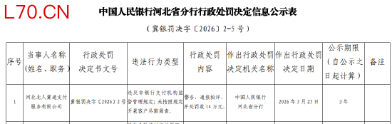 配资网站4月3日金融一线消息,据中国人民银行河北省分行行政处罚决定信息公示表显示,河北北人冀通支付服务有限公司因违反非银行支付机构监督管理规定、未按照规定开展客户尽职调查,被警告、通报批评,并处罚款14万元。