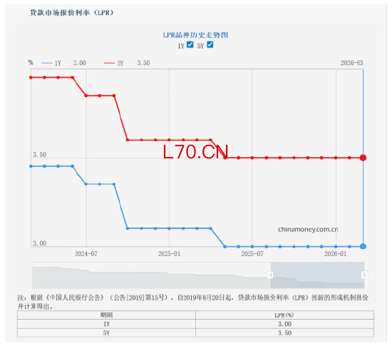 3月20日,中国人民银行授权全国银行间同业拆借中心公布,2026年3月20日贷款市场报价利率(LPR)为:1年期LPR为3.0%,5年期以上LPR为3.5%。以上LPR在下一次发布LPR之前有效。