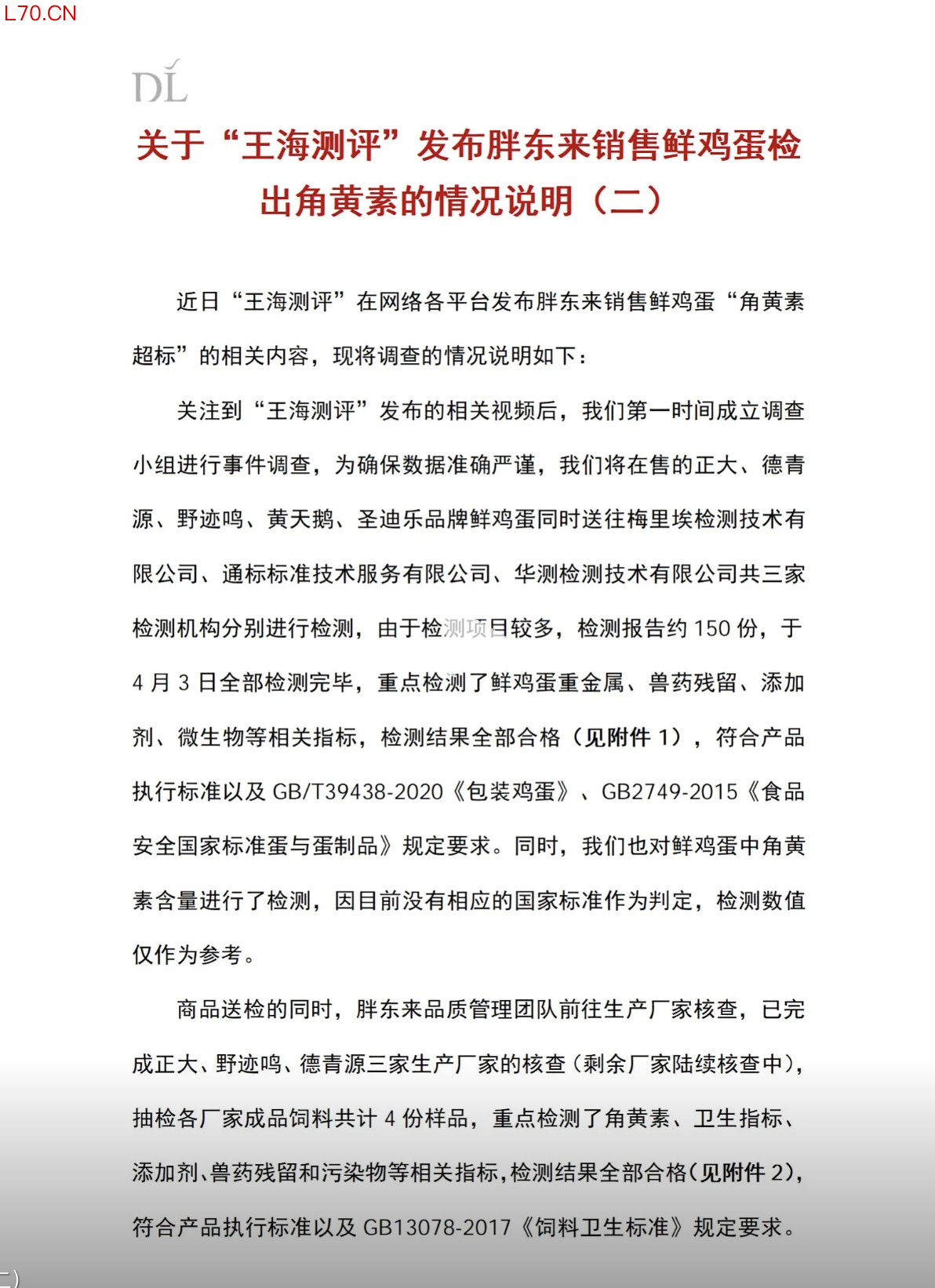 4月5日,胖东来官方账号发布关于“王海测评”发布胖东来销售鲜鸡蛋检出角黄素的情况说明(二):关注到“王海测评”发布的相关视频后,我们第一时间成立调查小组进行事件调查,将在售的正大、德青源、野迹鸣、黄天鹅、圣迪乐品牌鲜鸡蛋同时送往三家检测机构分别进行检测,由于检测项目较多,检测报告约150份,于4月3日全部检测完毕,重点检测了鲜鸡蛋重金属、兽药残留、添加剂、微生物等相关指标,检测结果全部合格,符合产品执行标准以及GB/T39438-2020《包装鸡蛋》、GB2749-2015《食品安全国家标准蛋与蛋制品》规定要求。同时,也对鲜鸡蛋中角黄素含量进行了检测,因目前没有相应的国家标准作为判定杠杆模式,检测数值仅作为参考。