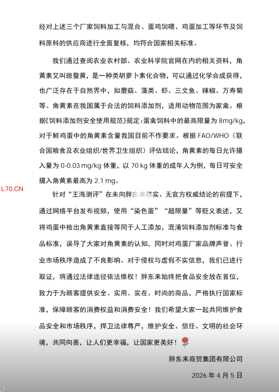 配资炒股 4月5日,胖东来官方账号发布关于“王海测评”发布胖东来销售鲜鸡蛋检出角黄素的情况说明(二):关注到“王海测评”