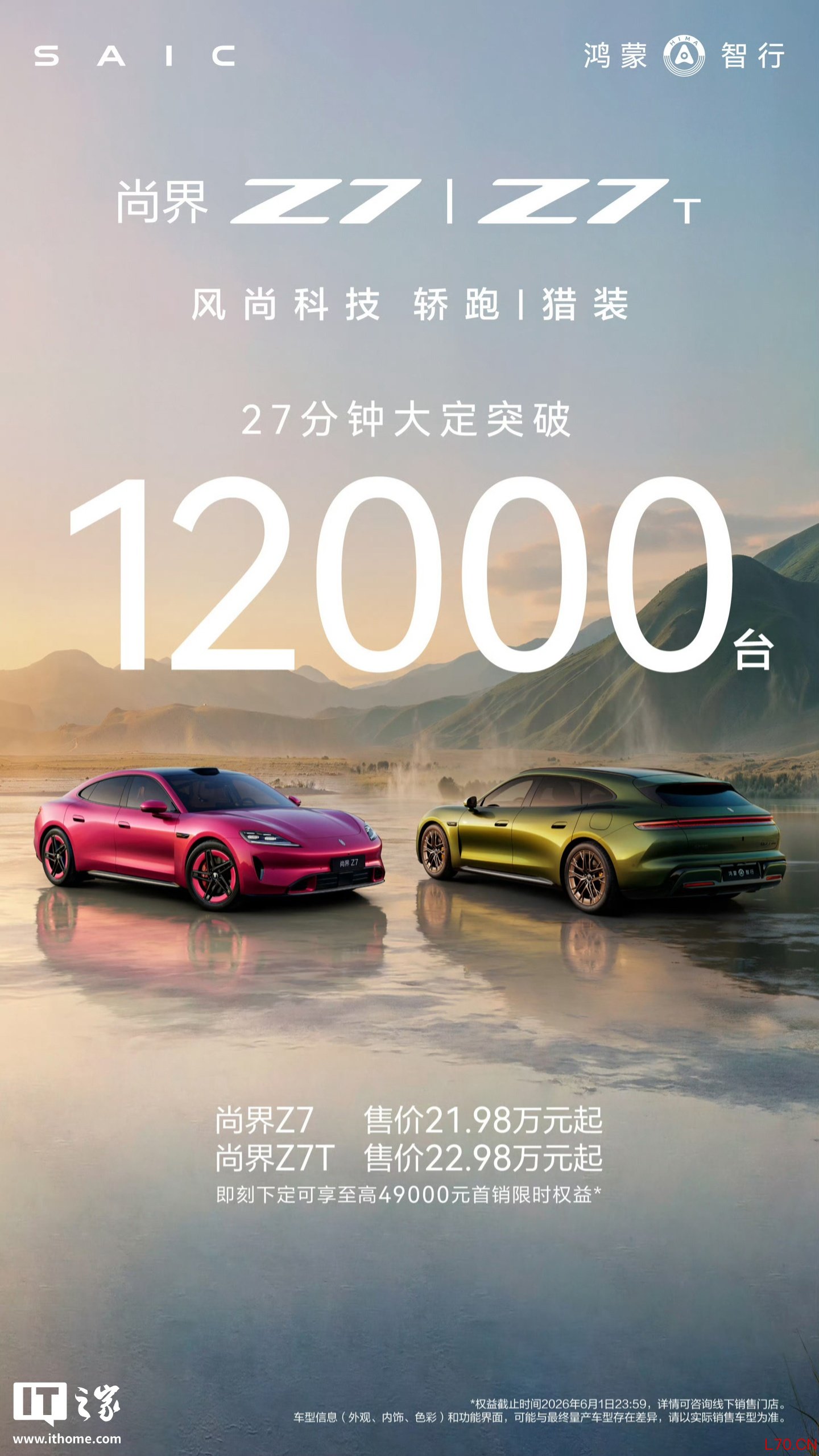 根据鸿蒙智行官方最新数据,尚界 Z7 / Z7T 两款新车 27 分钟大定破 1.2 万台。