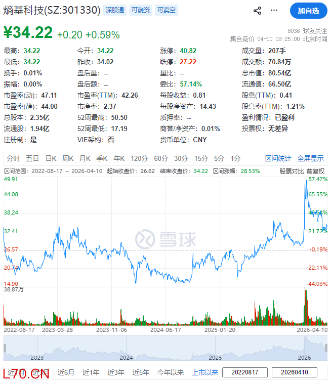 熵基科技(301330.SZ)于2022年8月17日在A股上市,于周五(4月10日)开盘,其总市值约80.54亿元人民币。