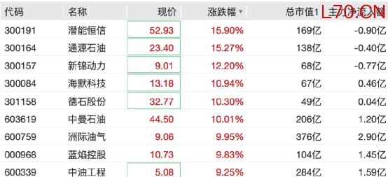 油气开采概念股大涨,潜能恒信、通源石油涨超15%,洲际油气等涨停,海默科技、德石股份、新锦动力涨超10%,中油工程等跟涨。