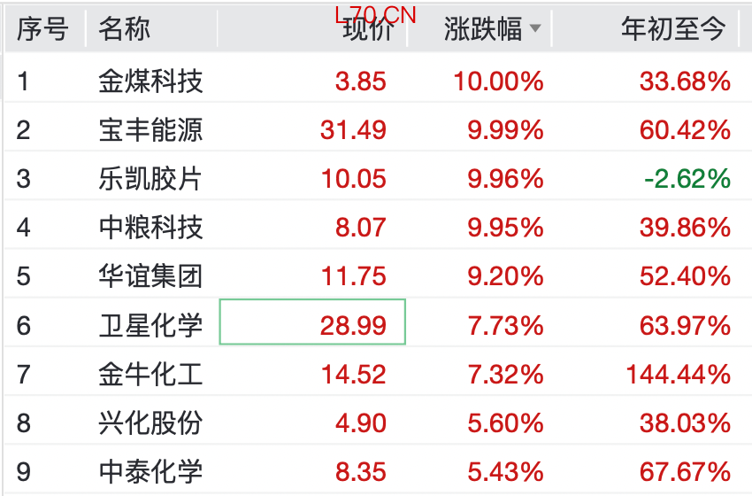 卫星化学、华鲁恒升、宝丰能源股价创新高,金牛化工盘初涨停,金煤科技、乐凯胶片、中粮科技等涨停。