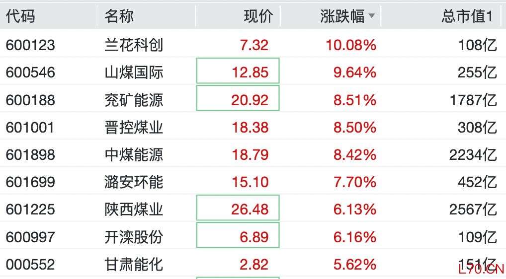 兰花科创录得10cm涨停,山煤国际涨超9%,兖矿能源、晋控煤业、中煤能源涨超8%。陕西煤业、潞安环能等纷纷跟涨。