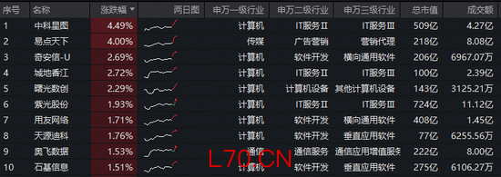 成份股方面,中科星图、易点天下领涨超4%,奇安信、城地香江、曙光数创涨逾2%,紫光股份、用友网络、天源迪科、奥飞数据等个股跟涨。
