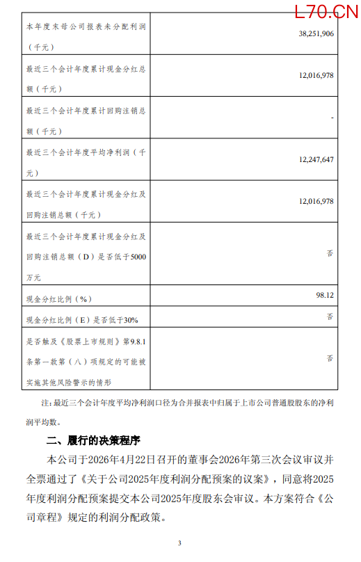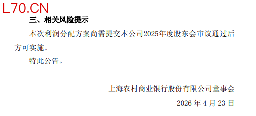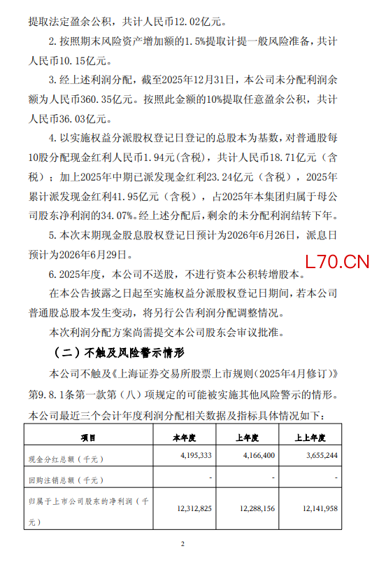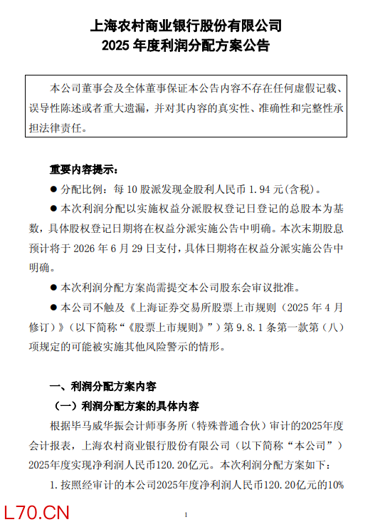 4月22日金融一线消息,沪农商行发布2025年度利润分配方案,拟每 10 股派发现金股利人民币1.94 元(含税)。以实施权益分派股权登记日登记的总股本为基数,对普通股每10股分配现金红利人民币1.94元(含税),共计人民币18.71亿元(含税);加上2025年中期已派发现金红利23.24亿元(含税),2025年累计派发现金红利41.95亿元(含税),占2025年本集团归属于母公司股东净利润的34.07%。经上述分配后,剩余的未分配利润结转下年。本次利润分配方案尚需提交本公司2025年度股东会审议通过后方可实施。